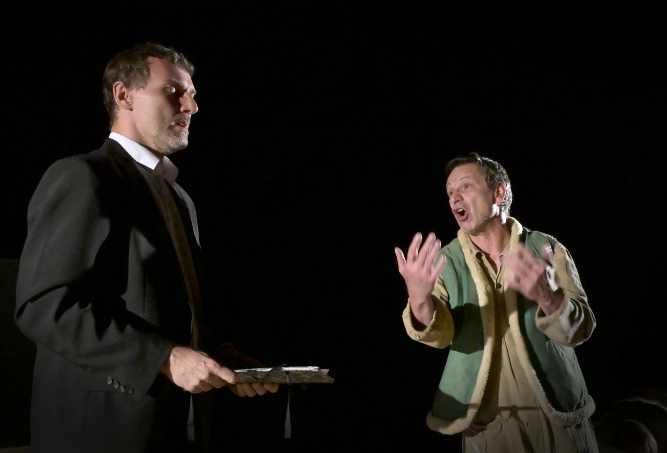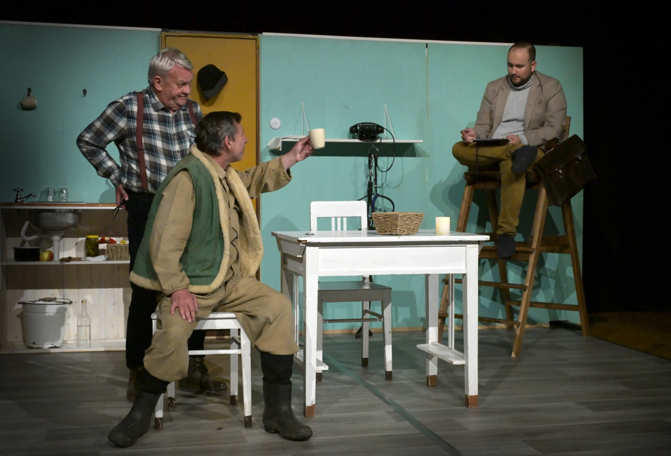 Zpočátku máme šanci obě postavy studovat beze slov. Sledujeme, jak Isak svého návštěvníka zlobí a provokuje, dělá mu naschvály, jak si z něj spolu s Grantem utahují. V těchto chvílích je Hrbek odsouzen k pouhému sezení v židli, zatímco Škach a především Milota naplno prokazují svůj komediální talent v rozehrávání poťouchlého mrzoutství. Když se konečně dostane i do interakce s Hrbkem, stane se Milotův Isak o něco milejším, ale pořád je to podivín; jejich vrcholnou scénou je pak pitka na oslavu Isakových narozenin, v níž oba dokážou výtečně pointovat a jejich cesta k opilosti je sice jevištní zkratkou, ale zcela uvěřitelnou. Sixten Jana Valty je navzdory své funkci spíše Folkeho nahrávačem, objevuje se většinou náhle a „odkudsi“ a jeho jedinou úlohou vlastně je neustále procházet sepsané protokoly, kroutit nad nimi hlavou a na závěr Folkeho vyhodit.
