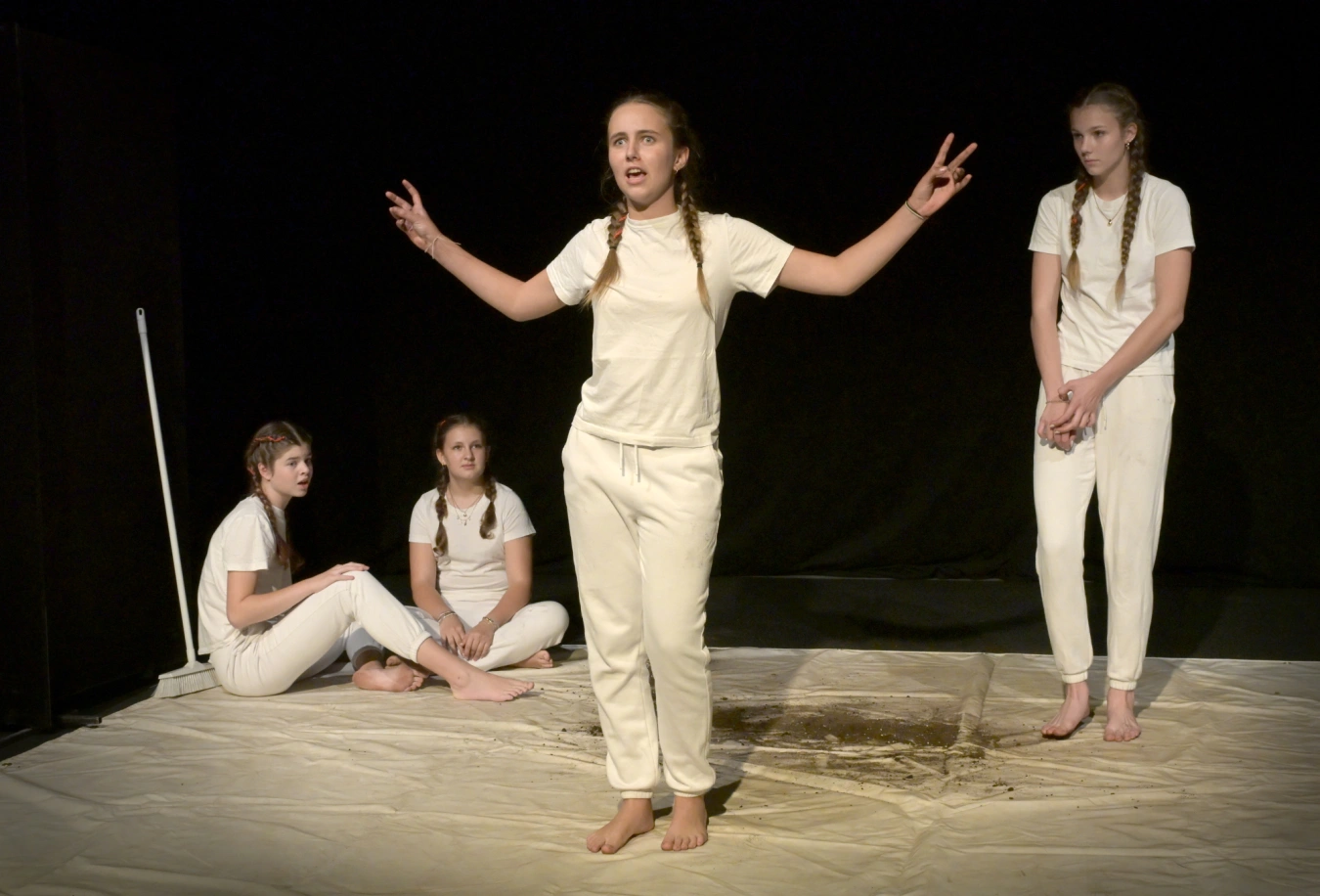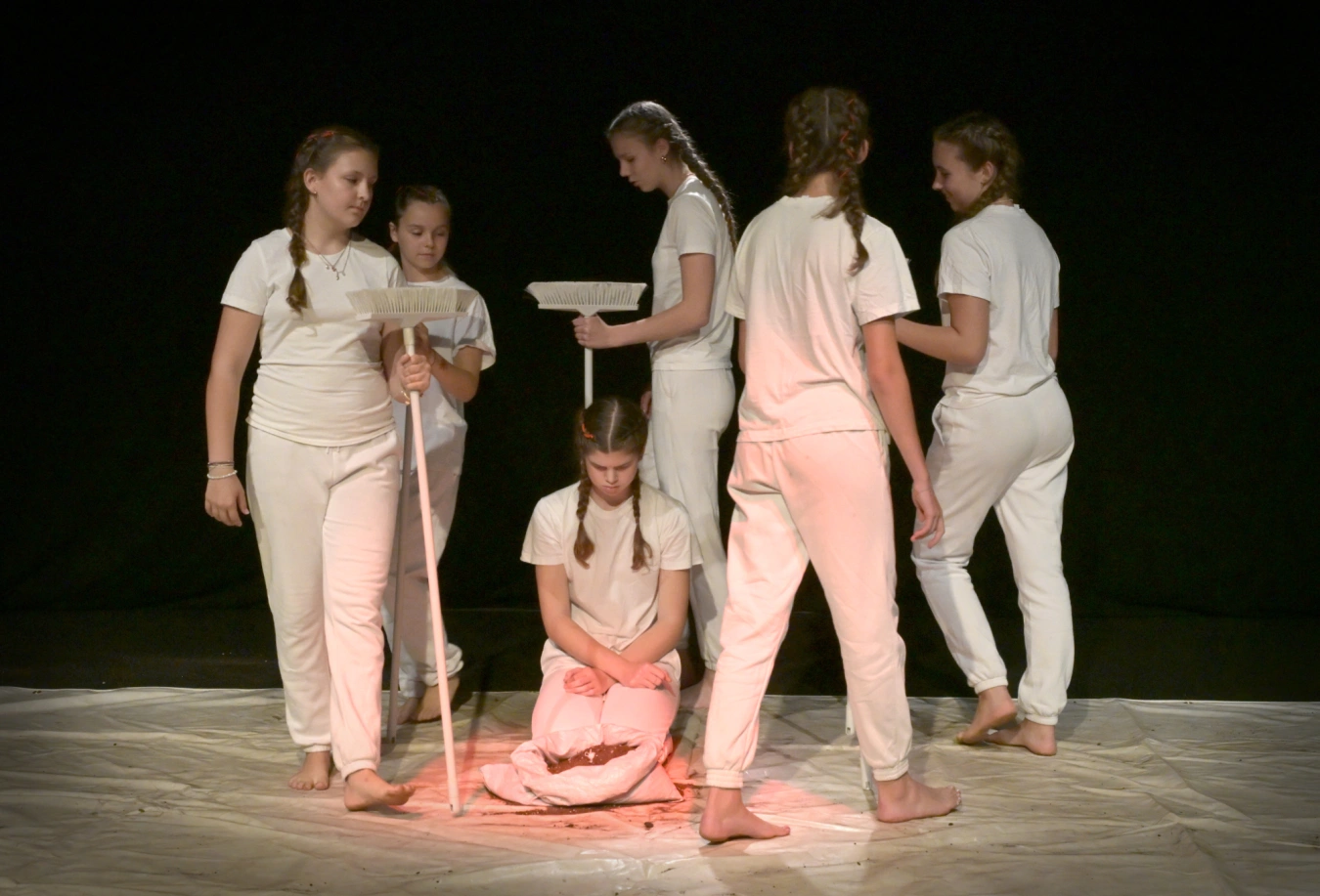 Skvěle vymyšlená se mi zdá minimalistická scénografie TO.ho, v níž hraje klíčovou roli hlína, materiál probouzející asociace, které tématu velmi dobře slouží – je to něco, čím se lze snadno umazat, ale je to taky něco zcela přirozeného, co je potřeba k tomu, aby to na světě všechno šlo, jak má. Je to šikovná metafora už proto, že zobrazování menstruační krve v reklamách provází žhavá diskuze, díky níž se konečně upouští od sterilní modré tekutiny a začíná se ve veřejném prostoru stále častěji připouštět, jak se věci mají. Bílé kostýmy performerek vysílají jasnou zprávu, že svou menstruaci přijímají a že se odmítají za ni stydět. Jsem za takové emancipační gesto tak mladých dívek vděčná.